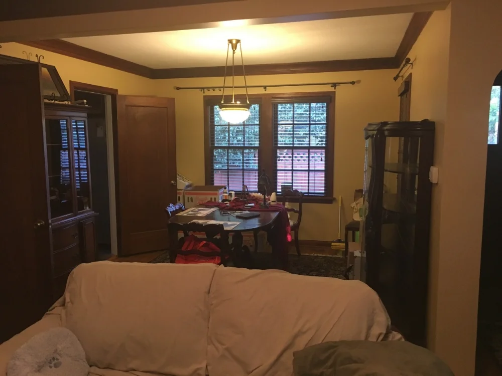 Before: Here in this dining room, it is hard to tell what space it is. There are way too many pieces of large furniture and the doors, being very dark, make the space feel tight.