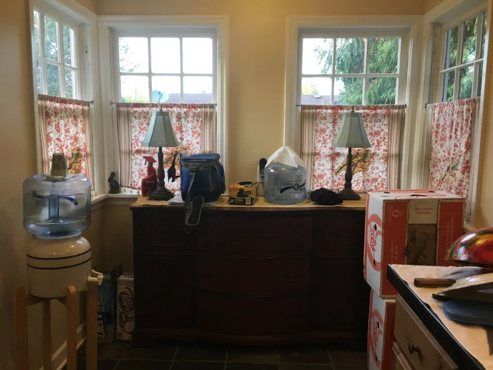 Before: In the kitchen nook area, the sellers have a large dresser and miscellaneous boxes and other items. It has become a sort of "catch-all" area. It makes the space feel cramped and dark.