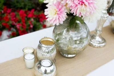 One of my favorite fall materials to use is burlap. I like to cut an 18" wide strip and use it as a runner. It is inexpensive and is a great starting point for so many different table top looks. I like to use two or three Mercury Glass hurricanes or vases and place them on the burlap. Burlap also looks great draped over upholstered dining chairs in the same width as the runner. Make it long enough to touch the seat and drape over the chair back so that it falls at least 18".