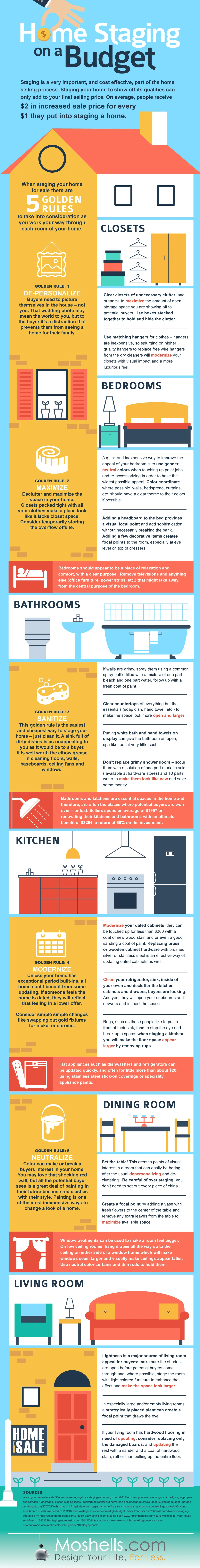 But for those who don't have the luxury of moving out prior to listing, the recommendations on the infographic will go a long way to expediting the sale of your home, and hopefully get you full price - or more! Whenever in doubt, hire a stager to help you know what to do to make your home looks its best. Many stagers offer several types of "staging" such as a Consultation for owner occupied homes where the stager walks through the home and gives suggestions, Occupied Home Staging where a few things are brought in, and Vacant Home Staging where stagers furnish and decorate entire rooms.
